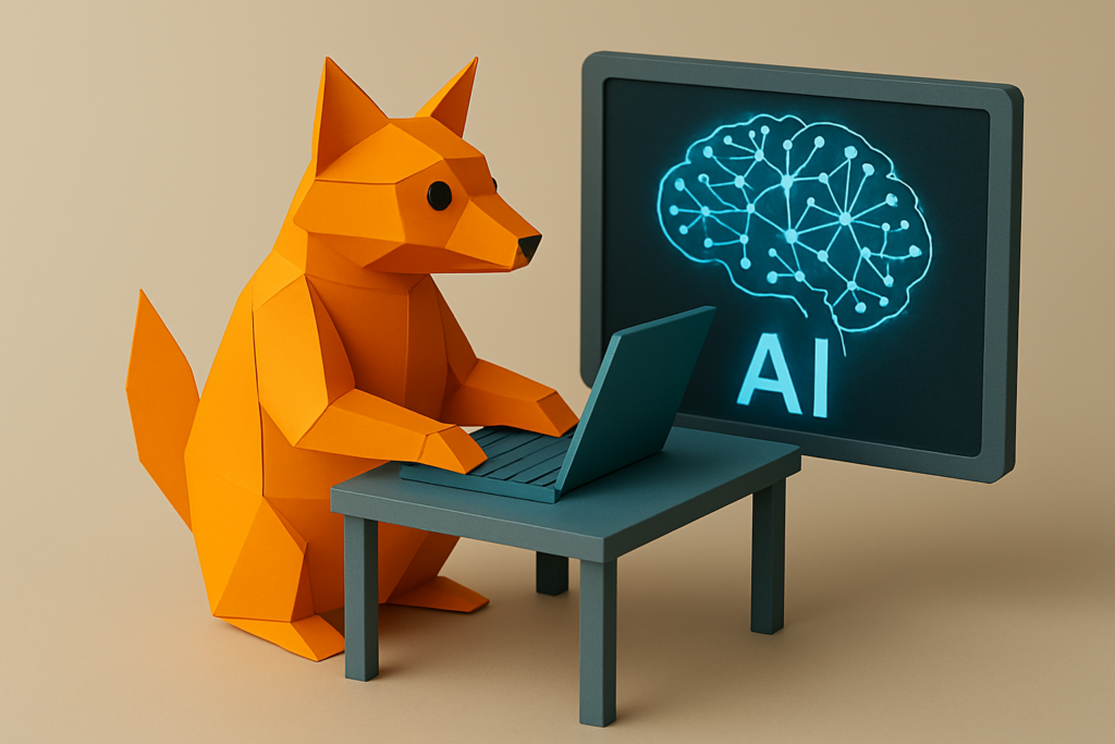 Marketech Renard en origami utilisant un ordinateur à côté d'un écran avec un cerveau numérique pour représenter l'IA.